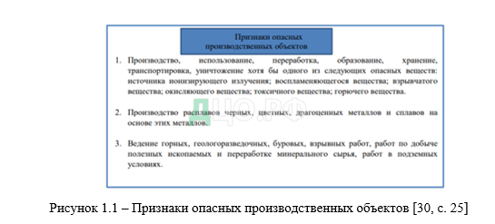 Промышленная безопасность поможет решить ряд задач: защитить работников, осуществляющих свою деятельность на опасных объектах; решить вопросы по защите экологии; снизить количества возможных аварий; выявить нарушение требований техники безопасности; обезопасить население от загрязняющих веществ, выбрасываемые в атмосферу. Рассматривая понятие опасные объекты стоит проанализировать признаки опасных производственных объектов, представленные на рисунке 1.1.