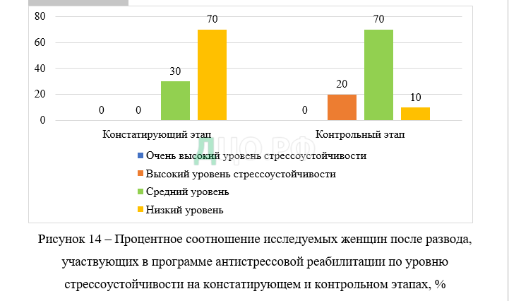 Так, после реализации антистрессовой программы количество исследуемых женщин после развода, имеющих высокий уровень невроза, снизилось с 50% на констатирующем этапе до 17% на контрольном этапе.