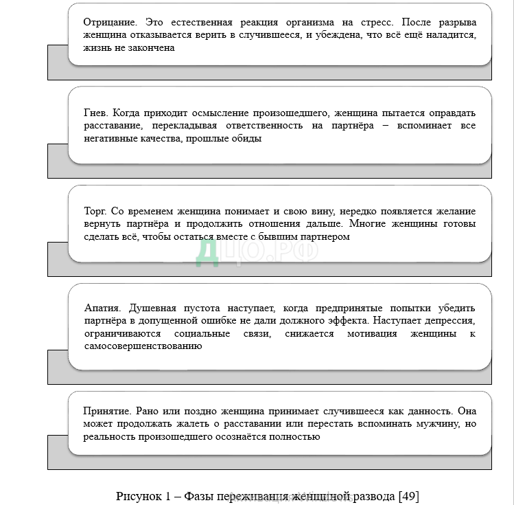 Г.А. Капашева с соавторами выделяют следующие фазы переживания женщиной развода, характеризующиеся конкретными особенностями (рис.1) [43].