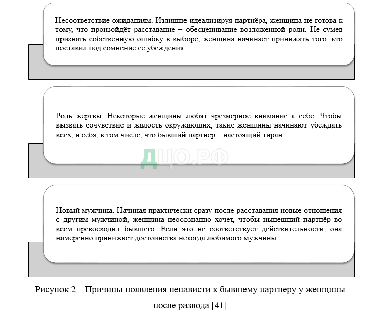 А.Г. Галиуллина пишет, что многие женщины после развода характеризуются появлением ненависти к бывшему партнеру, что говорит о потере значимости данного мужчины для женщины. Причинами появления ненависти к бывшему партнеру у женщины после развода представлены на рисунке 2 [41].