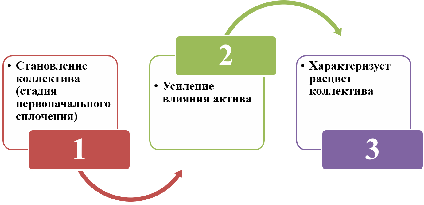 На данном слайде представлены стадии формирования коллектива по теории А. С. Макаренко. Первая стадия – это становление коллектива (стадия первоначального сплочения). Вторая стадия – это усиление влияния актива. Третья и последующие стадии характеризуют расцвет коллектива.