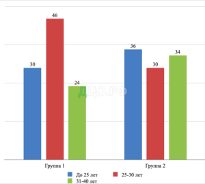 По результатам анкетирования женщин с бесплодием (группа 1) выявлено, что основная часть женщин данной категории имеет возраст от 25 до 30 лет (46%), остальная часть женщин с бесплодием распределилась следующим образом: 30% женщины в возрасте до 25 лет и 24% женщин с бесплодием имеют возраст с 31 до 40 лет.