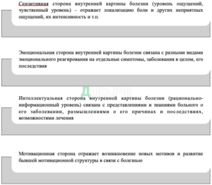М.М. Кашапов подчеркивает, что внутренняя картина болезни является психологическим отражением действия болезни на психику. Автор в структуре внутренней картины болезни выделяет следующие компоненты: