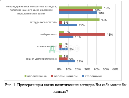 Так, в группе активистов-сторонников наблюдаются разносторонние предпочтения. Они рассматривают привлекательной политическую деятельность как таковую, не выделяя определенную партию в качестве приоритета. Кроме того, 43% опрошенных вообще затрудняются дать ответ на вопрос о приверженности к политическим движениям. При этом около половины активистов-оппозиционеров придерживаются идеологии либеральных политических сил, что может являться свидетельством стремления к открытости, свободе, принятию концепций и убеждений других партий. Между тем, 36% представителей данной группы не могут сказать, что они выбрали какую-то одну партию или направления. Для них политика – скорее многоплановая сфера деятельности, в которой они могут проявить себя и привнести свои идеи преобразования мира. Аполитичные молодые люди не имеют идеологических ориентиров среди политических движений, в связи с чем, более половины представителей данной группы рассматривают политику как общую сферу жизни, к которой они не хотят иметь отношения (40%), либо не могут назвать конкретных партий и движений, которым они симпатизируют (19%).