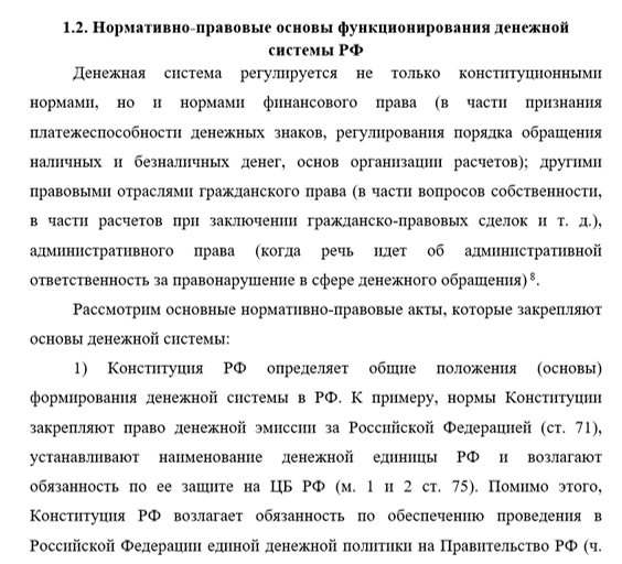 Информационную базу исследования составляют нормативно-правовые акты РФ, в частности, Конституция РФ, а также научная литература, монографии, методические разработки, пособия и материалы периодических изданий, материалы исследований о денежной системе и денежно-кредитной политике РФ.