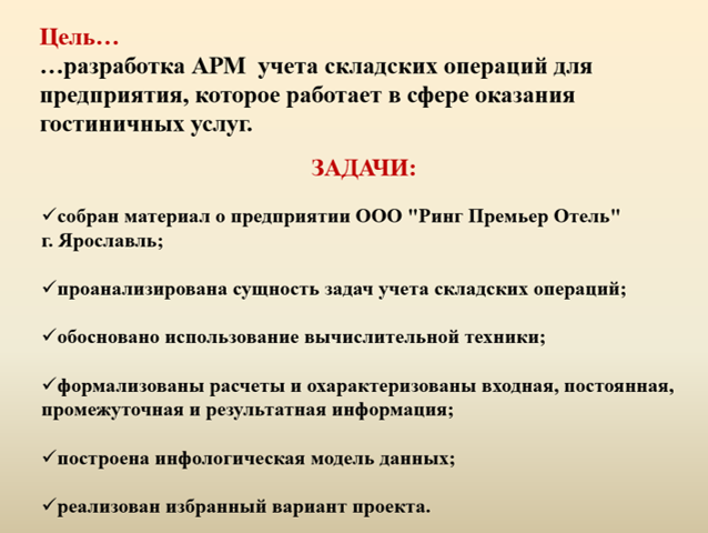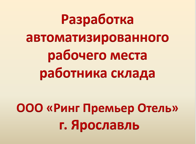 Тема: Разработка автоматизированного рабочего места работника склада на примере ООО «Ринг Премьер Отель» г. Ярославль