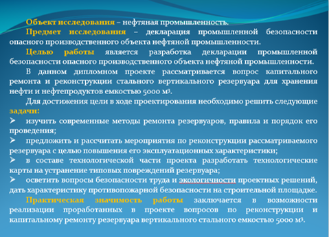 Предмет исследования – декларация промышленной безопасности опасного производственного объекта нефтяной промышленности.
