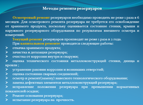 Текущий ремонт резервуаров производят не реже 1 раза в 2 года.