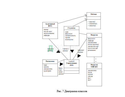 Далее строится структурно-логическая схема системы в виде диаграммы классов (см. рис.7). Эта диаграмма служит для представления статической структуры модели системы, различных взаимосвязей между отдельными сущностями предметной области, такими, как объекты и подсистемы, а также описания их внутренней структуры и типов отношений. Мы предполагаем существование в системе следующих классов: аудиторный фонд, студенты, нагрузка, расписание, управляющее окно и таблица. Класс «Таблица» является абстрактным: он не имеет экземпляров и связан с классами «Аудиторный фонд», «Студенты» и «Нагрузка» отношением наследования. Стереотип «control» класса «Управляющее окно» указывает на то, что этот класс отвечает за координацию действий других классов.