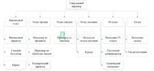 В финансовый отдел входят: финансовый директор, главный бухгалтер, юрист. В отделе продаж работают менеджер по продажам, менеджер по обработке заказов под начальством коммерческого директора. В отделе закупок работают менеджеры по закупкам. Отдел доставки состоит из начальника отдела и курьеров. В IT-отдел входят: начальник отдела, системный администратор, технический специалист. Склад состоит из начальника склада и укомплектовщиков.
