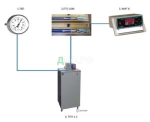 «Определение приведенной к диапазону измерений погрешности и вариации показаний измерений температуры производится методом сравнения с эталонным термометром. В термостат жидкостный (калибратор сухоблочный) помещают калибруемый термометр ТБП. Эталонный термопреобразователь сопротивления ПТС-10М подключают к измерителю температуры многоканальный прецизионный МИТ 8.10 и погружают в термостат с калибруемым прибором (рисунок 28).