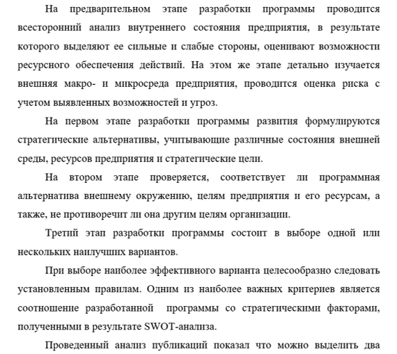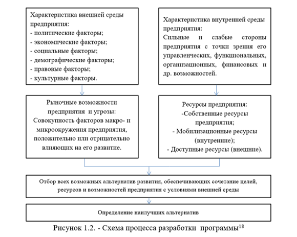 В сравнении с подходами зарубежных авторов, трактовки, даваемые отечественными представителями более полные и комплексные. На наш взгляд наиболее оптимальным определением программы развития является трактовка авторов Бородакого Ю.В. и Авдонина Б.Н.. Данное определение включает все аспекты деятельности предприятия, возможные ресурсы, учитываемые при разработке программы развития, а так же ее этапы.