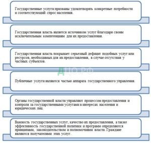 Государственные услуги играют важную роль в политике и образовании государства. Они являются основой государственных программ и реализуются согласно принципам и законодательству. Правительство и органы государственной власти ответственны за предоставление государственных услуг населению и другим получателям услуг [37, c. 96].