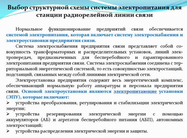 Нормальное функционирование предприятий связи обеспечивается системой электропитания, которая включает систему электроснабжения и электроустановки предприятия связи.