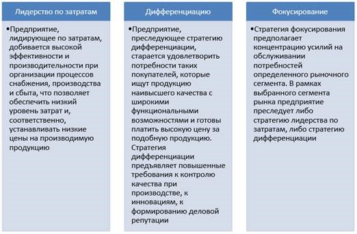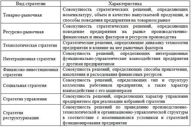 Стратегия — это генеральная программа действий, которая выявляет приоритеты проблем и ресурсы для достижения основной цели. Она формулирует главные цели и основные пути их достижения таким образом, что предприятие получает единое направление движения[3]. Стратегия — это долгосрочный курс развития фирмы, способ достижения целей, который она определяет для себя, руководствуясь собственными соображениями в пределах своей политики.