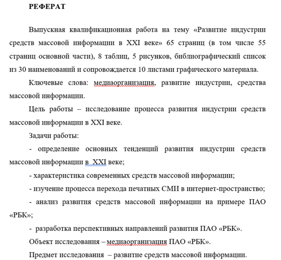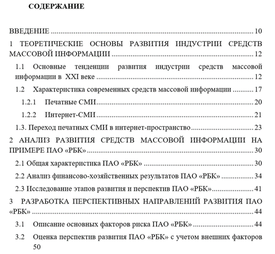 Первая глава посвящена раскрытию теоретических основ развития индустрии средств массовой информации. Вторая глава содержит анализ развития средств массовой информации на примере ПАО «РБК». Третья глава представлена разработкой перспективных направлений развития ПАО «РБК» с учетом внешних факторов.