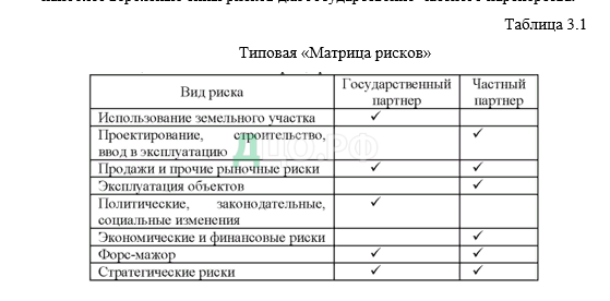 Далее представлена таблица 3.1 «Матрица рисков», в которой показаны наиболее вероятные типы рисков для государственно-частного партнерства.