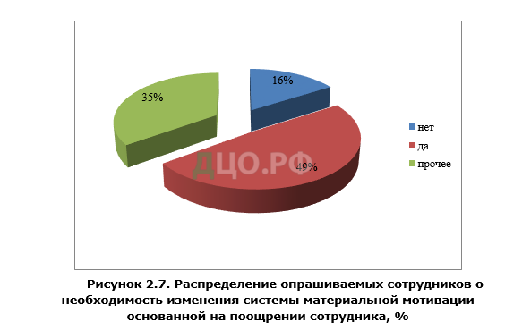 Как показывают данные рисунка 2.7., большинство опрошенных сотрудников компании ООО «ПК Венткомплекс» не довольны действующей структурой матриальной мотивации, которая основывается на поощрении сотрудника, так же этот процент опрошенных предлагают внести изменения в применяемую систему.