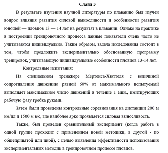 В результате изучения научной литературы по плаванию был изучен вопрос влияния развития силовой выносливости и особенности развития юношей — пловцов 13 — 14 лет на результат в плавании. Однако на практике в построении тренировочного процесса данные показатели очень часто не учитываются индивидуально. Таким образом, задача исследования состоит в том, чтобы предложить экспериментально обоснованную программу тренировок, учитывающую индивидуальные особенности пловцов 13-14 лет.