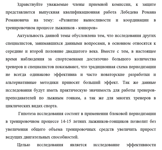 Здравствуйте уважаемые члены приемной комиссии, к защите представляется выпускная квалификационная работа Лебедева Романа Романовича на тему: «Развитие выносливости и координации в тренировочном процессе лыжников — юниоров»