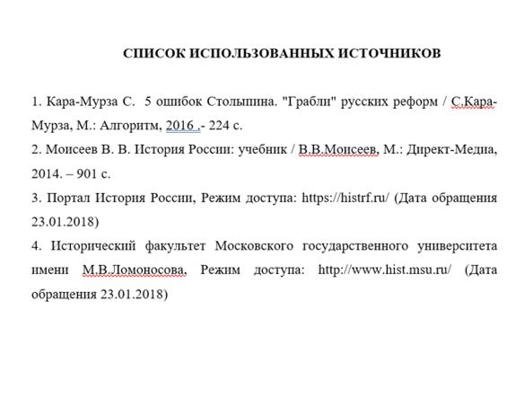 [1] Моисеев В. В. История России: учебник, М.: Директ-Медиа, 2014.С.308. [2] http://www.hist.msu.ru/Labour/zakon1897/index.htm [3] https://histrf.ru/biblioteka/book/stolypinskaia-aghrarnaia-rieforma-kak-ona-nie-otmienila-rievoliutsiiu [4] Сергей Кара-Мурза: 5 ошибок Столыпина. «Грабли» русских реформ, М.: Алгоритм, 2016 .С. 198.Прикрепленные файлы: