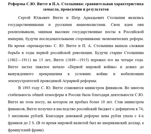 В ходе сбора и изучения материалов для написания данного эссе, я всё же пальму первенство отдала Витте. Да, аграрная реформа Столыпина имела большое значение для развития страны, но сам Петр Аркадьевич указывал, что аграрная реформа это только часть комплекса реформ, которые должны были идти в стране на протяжении десятилетий. В целом же что в советском, что и в современном российском обществе даны противоположные оценки его реформ. Хотя следует отметить, что после убийства самого Столыпина реформа была не завершена и сложно говорить о том, к чему бы она могла в итоге привести.