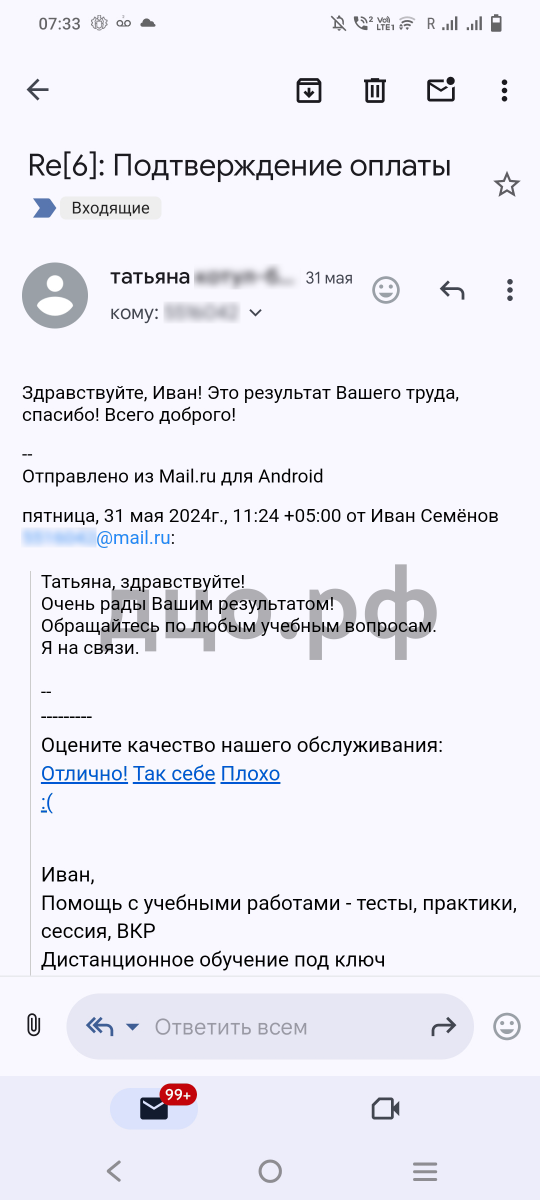 Добрый день, Иван! Тест пройден успешно, спасибо Вам большое, в данный момент помощь не требуется, если возникнут вопросы, я обязательно напишу, а также, порекомендую вашу организацию знакомым.