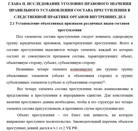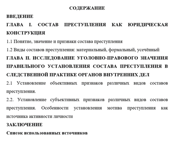 Структура работы — работа состоит из введения, трех глав, методической разработки, заключения. Введение раскрывает актуальность темы, определяет объект, предмет, цели и задачи исследования. В первой главе рассматриваются понятие и значение состава преступления в уголовном праве, а так же классификация составов преступлений и их значение для квалификации преступлений. Во второй главе раскрываются элементы состава преступления, рассматриваются объективная сторона и субъективная сторона. В заключении подводятся итоги исследования и образуются выводы.