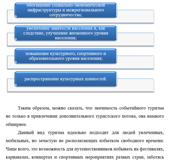 Событийные мероприятия могут выступать в качестве катализатора для самой туристической сферы, развития общественных движений и формирования положительного имиджа и инвестиционной привлекательности территории (как страны, так и отдельно взятого региона).
