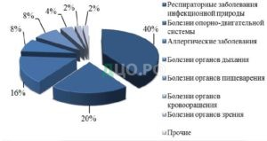 Показано, что большую часть в структуре заболеваемости составили аллергические заболевания (31%), нарушения зрительного анализатора (24%), болезни опорно-двигательного аппарата (14%).