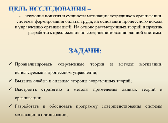 Цель исследования: изучение понятия и сущности мотивации сотрудников организации, системы формирования оплаты труда, на основании процессного похода к управлению организацией. На основе рассмотренных теорий и практик разработать предложения по совершенствованию данной системы.