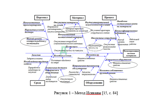 Далее проанализировав риски процесса «Закупки» нами был определен один из критических рисков это несвоевременная поставка материалов. Для того чтобы минимизировать данный риск нам необходимо выявить причины возникновения рискового события. Нами был выбран метод Исикавы (рисунок 3.1), этот инструмент используют для улучшения процессов и результатов.