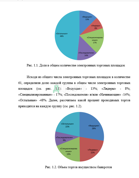 V. «Остальные». Операторы электронных торговых площадок, которые прекратили свою деятельность (сайты не работают) или объемы торгов минимальны и по другим критериям набирают низкие оценки. Сюда же мы отнесли ЭТП, сайты которых находятся на серверах США или других иностранных государств, либо предоставляют только незащищенное соединение, в т.ч.: «Арбитат» (arbitat.ru); «Открытая торговая площадка» (opentp.ru); «Property Trade» (propertytrade.ru); «Системы ЭЛектронных Торгов» (selt-online. ru); «ТЕНДЕР ГАРАНТ» (tendergarant.com) «Аукционы Дальнего Востока» (torgidv.ru); «Балтийская электронная площадка» (bepspb. ru); «Объединенная Торговая Площадка» (utpl.ru); «Уральская электронная торговая площадка» (etpu.ru); «Электронная площадка Центра реализации» (centerr.ru); «Электронная площадка ЭСП» (el-torg.com); «Регион» (gloriaservice.ru); «Заказ РФ» (eksystems.ru); «ЮГРА» (etpugra.ru) и др. Сначала определим, сколько процентов от общего числа всех анализируемых электронных торговых площадок, т.е. от шестидесяти одной, занимает каждая группа [30, c. 74].