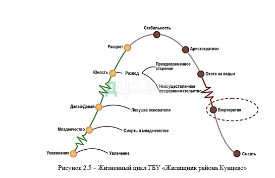 По вопросу жизненного цикла организации можно отметить, что она находится на стадии бюрократизации, что соответствует старению (рисунок 2.5).
