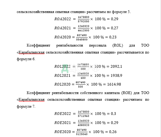 Рентабельность предприятия ТОО «Карабалыкская сельскохозяйственная опытная станция» также выросла по всем пунктам: рентабельность деятельности (ROM) в 2022 году возросла на 0,03 п.п.; рентабельность собственного капитала (ROE) возросла на 0,01 п.п.; рентабельность персонала (ROL) возросла на 153,2 п.п.; рентабельность активов предприятия (ROA) возросла на 0,02 п.п.; рентабельность продаж (ROS) возросла на 0,02 п.п.
