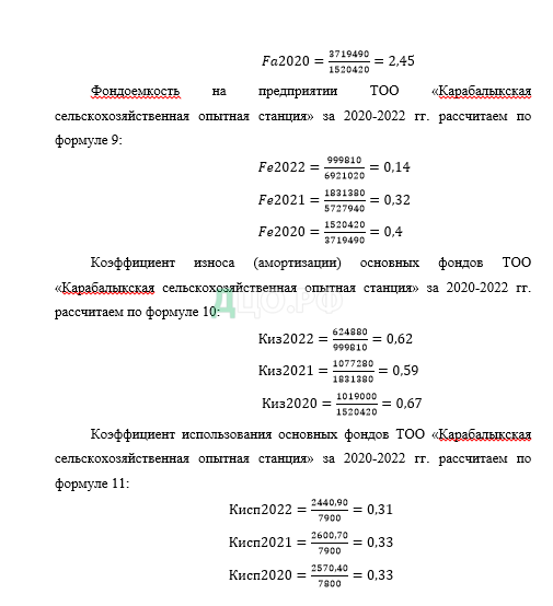 Проведем анализ основных производственных фондов (фондоотдача, фондоемкость, коэффициент износа (амортизации) основных фондов, коэффициент использования основных фондов) ТОО «Карабалыкская сельскохозяйственная опытная станция» за 2020-2022 гг.