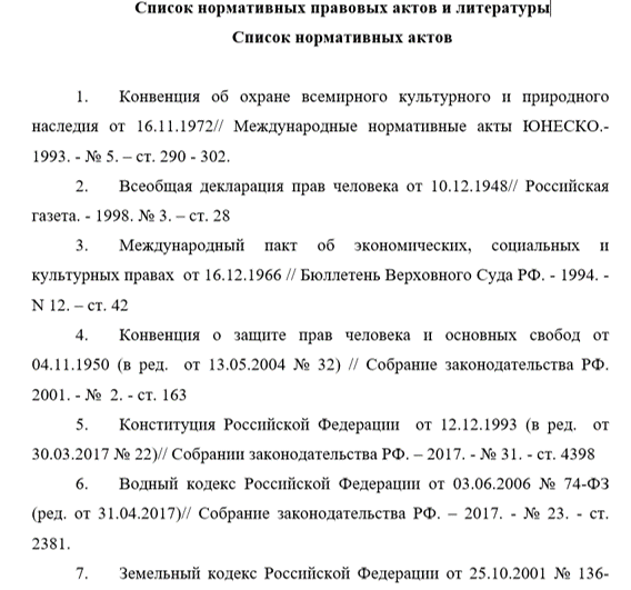 - Водный кодекс Российской Федерации от 03.06.2006 № 74-ФЗ (ред. от 31.04.2017)// Собрание законодательства РФ. – 2017. — № 23. — ст. 2381.