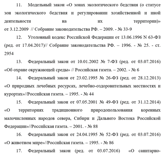 - Федеральный закон от 10.01.2002 № 7-ФЗ (ред. от 03.07.2016) «Об охране окружающей среды» // Российская газета. – 2002. — № 6