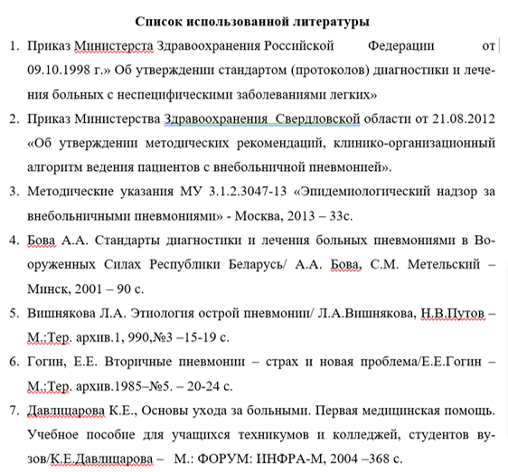- Никонова Е.В. Пневмонии, эпидемиология, классификация, клинико- диагностические аспекты/ Е.В.Никонова, А.Г.Чучалин, А.Л.Черняев – М.:«Русский мед. журнал»,1998 – Т.5 – №17 –1095-1099 с.