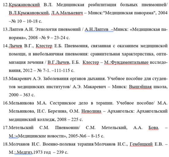 - Бова А.А. Стандарты диагностики и лечения больных пневмониями в Вооруженных Силах Республики Беларусь/ А.А. Бова, С.М. Метельский – Минск, 2001 – 90 с.