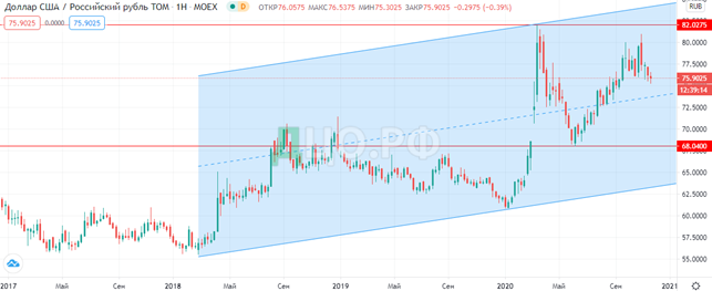 — снижение объема покупательной способности населения (54% по мнению респондентов), поскольку по данным Росстата, реальные располагаемые денежные доходы населения во втором квартале 2020 года упали сразу на 8,4% в годовом выражении [40] — изменение структуры потребительской корзины населения (39% по мнению респондентов). Данные торговых сетей России указывают, что россияне по-прежнему тратят больше, чем годом ранее, на продукты (+4,1% год к году) и все сильнее сокращают расходы на непродовольственные товары и услуги [41] — наращивание девальвационных рисков курса российского рубля (36% по мнению респондентов), подтверждением чему является график на рисунке 12, где проведен технический анализ валютной пары доллар/рубль.