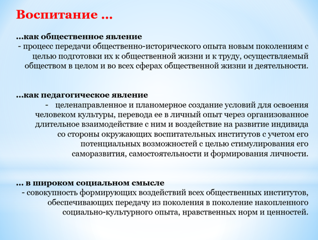 -целенаправленное и планомерное создание условий для освоения человеком культуры, перевода ее в личный опыт через организованное длительное взаимодействие с ним и воздействие на развитие индивида со стороны окружающих воспитательных институтов с учетом его потенциальных возможностей с целью стимулирования его саморазвития, самостоятельности и формирования личности.