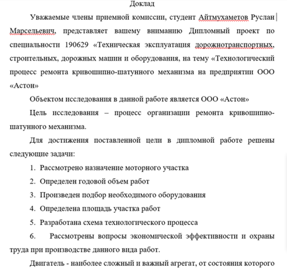 Уважаемые члены приемной комиссии, студент Айтмухаметов Руслан Марсельевич, представляет вашему вниманию Дипломный проект по специальности 190629 «Техническая эксплуатация дорожнотранспортных, строительных, дорожных машин и оборудования, на тему «Технологический процесс ремонта кривошипно-шатунного механизма на предприятии ООО «Астон»