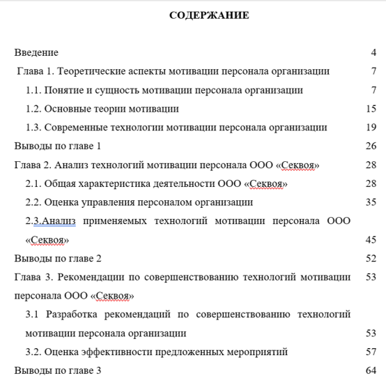 Первая глава направлена на теоретическое изучение системы мотивации персонала и всех ее составляющих, существующих теорий мотивации, а так же применяемых в настоящее время технологий. Во второй главе проводится анализ технологий мотивации персонала ООО «Секвоя», оценивается система управления персоналом организации. Третья глава посвящена разработке рекомендаций по совершенствованию технологий мотивации персонала ООО «Секвоя» и оценке их эффективности.