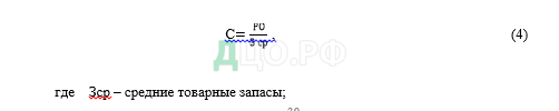 Скорость оборота (С) или время обращения товаров в количестве оборотов определяется по формуле (4):