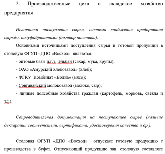 Обработка сырых и готовых продуктов производит раздельно в специально оборудованных цехах столовой ФГУП «ДПО «Восход» с использованием инвентаря с соответствующей маркировкой.