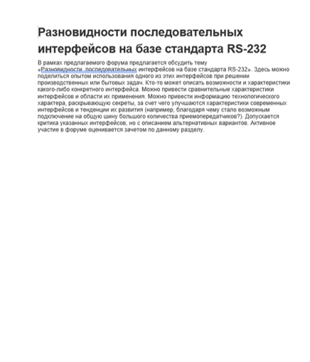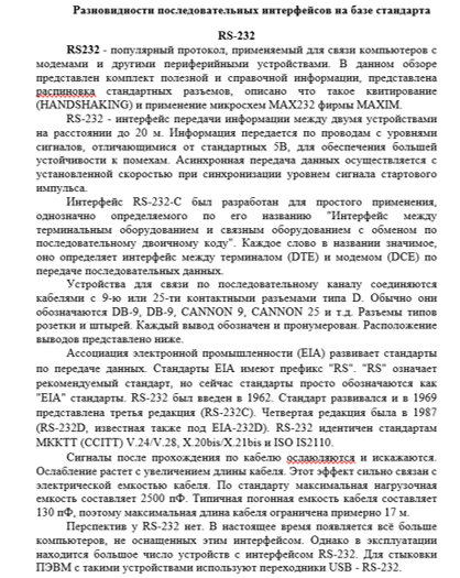 RS-232 — интерфейс передачи информации между двумя устройствами на расстоянии до 20 м. Информация передается по проводам с уровнями сигналов, отличающимися от стандартных 5В, для обеспечения большей устойчивости к помехам. Асинхронная передача данных осуществляется с установленной скоростью при синхронизации уровнем сигнала стартового импульса.