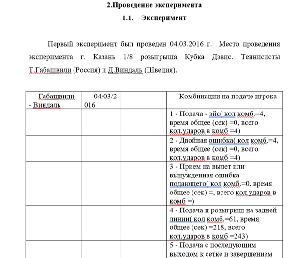 С целью получения достаточно устойчивых результатов эксперимента было решено провести наблюдение в течение несколько матчей за каждым представителям эксперимента. Общий объем экспериментального материала составил 7 матчей, 104 комбинации. Эксперимент велся входе розыгрыша Кубка Дэвиса за 2016-17гг и Кубок Кремля 2016 г.