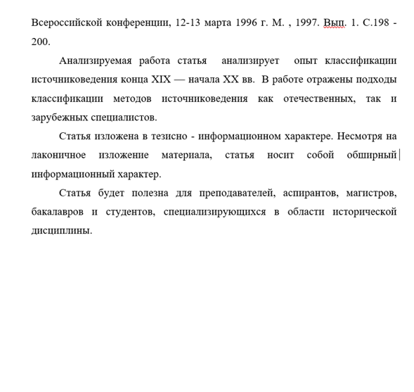 Анализируемая работа статья анализирует опыт классификации источниковедения конца XIX — начала XX вв. В работе отражены подходы классификации методов источниковедения как отечественных, так и зарубежных специалистов.