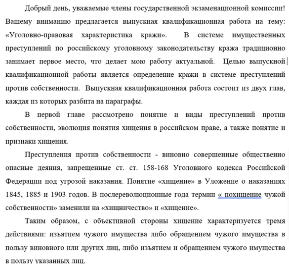 Добрый день, уважаемые члены государственной экзаменационной комиссии! Вашему вниманию предлагается выпускная квалификационная работа на тему: «Уголовно-правовая характеристика кражи». В системе имущественных преступлений по российскому уголовному законодательству кража традиционно занимает первое место, что делает мою работу актуальной. Целью выпускной квалификационной работы является определение кражи в системе преступлений против собственности. Выпускная квалификационная работа состоит из двух глав, каждая из которых разбита на параграфы.